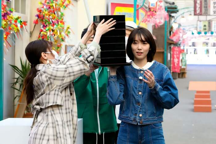 飯豊さんは、垂直に腰を下ろしながら立て膝をつき、見事なバランス力を披露。長い脚を華麗に折りたたむ姿に「かっこいいです!」「タカラジェンヌみたい」という声がかかる中、地面にあるせいろを手に取りました。