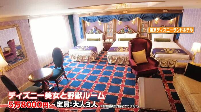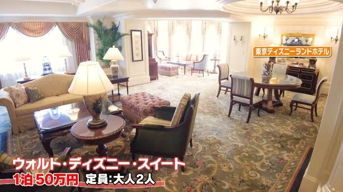 また、1泊50万円という国内のディズニーホテルの中で一番広いスイートルームでは、クラシック調の家具で統一された広いリビングがあり、お風呂では最上階からの眺めも楽しめます。