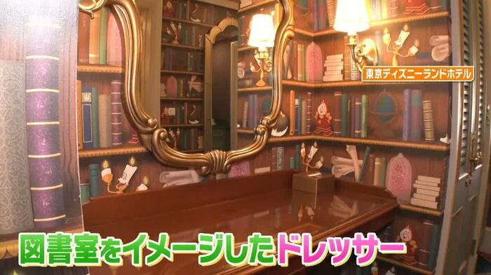 この客室は、バラの絵が描かれたベッドのヘッドボードや、お城の図書室をイメージしたドレッサーなど、映画の中に入りこんだような感覚が味わえるととっても人気なんです!