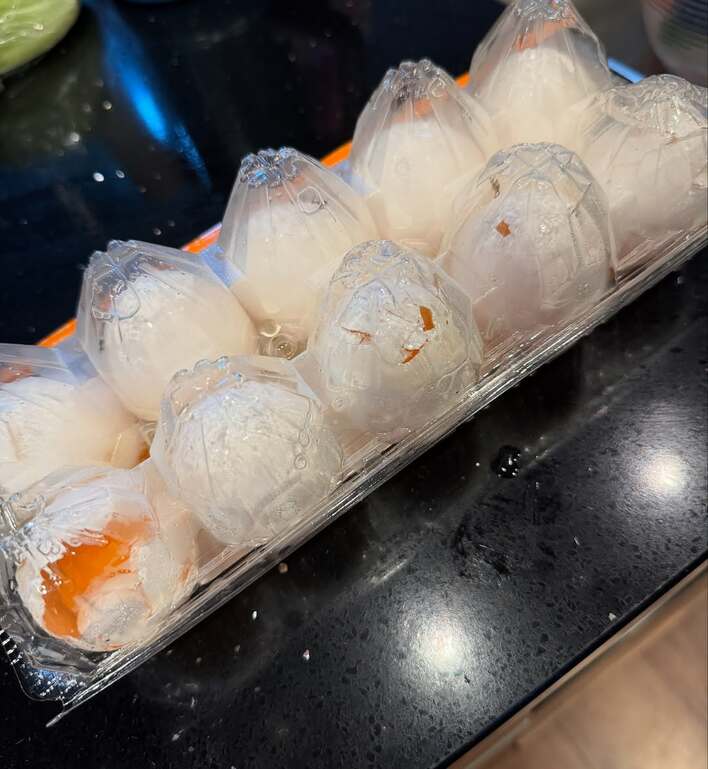 そこには、無残にも、パックの中で割れた卵たちが…。