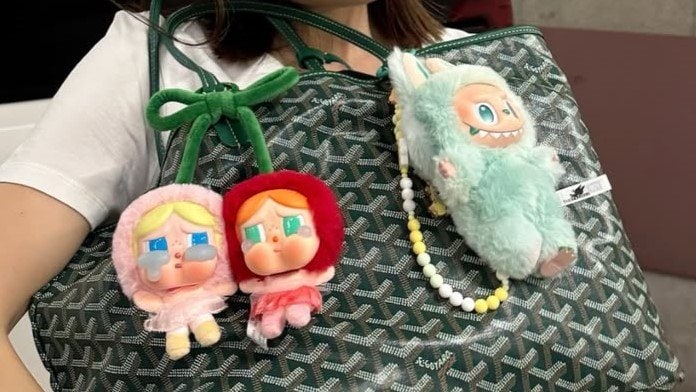 大きなグリーンのバッグには、世界的ブームとなっている「Labubu(ラブブ)」と「クライベイビー(Crybaby)」がついています。