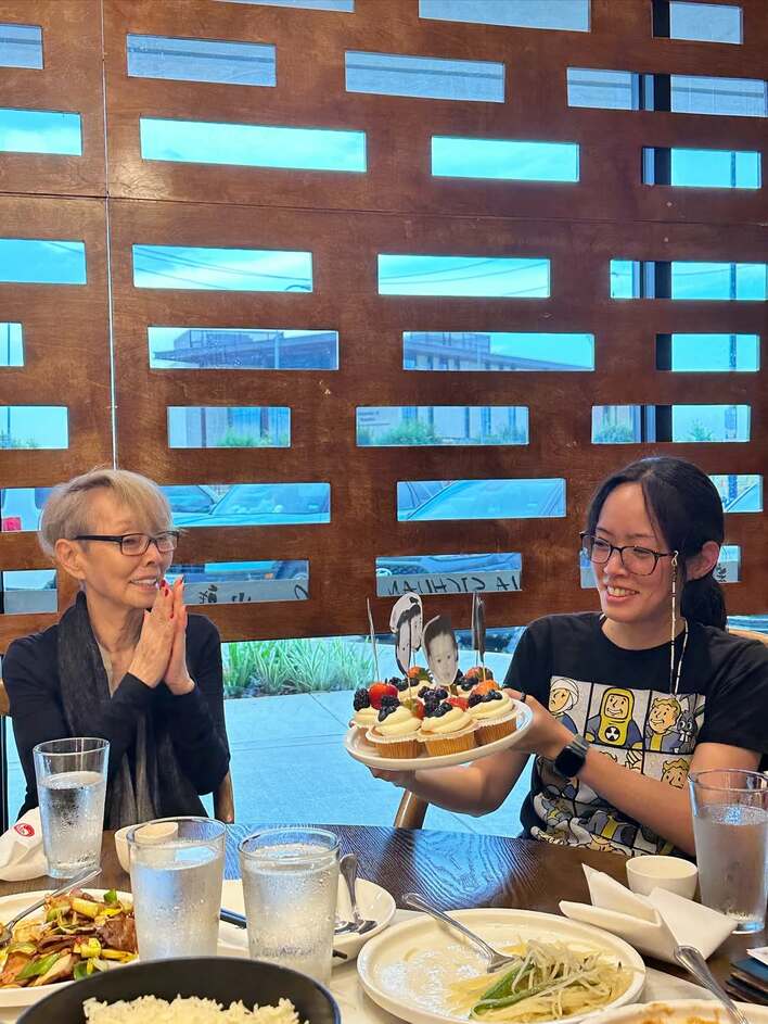 母から贈られたケーキに感動の眼差しを送るひとみさん。それもそのはず、写真をよく見ると、カップケーキに刺さっているのは…