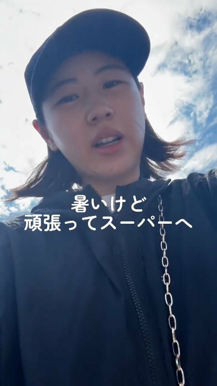 映像は、「暑いけど頑張ってスーパーへ」と にこりちゃんと一緒に買い出しへ向かう様子から始まります。そこには、帽子をかぶった姿で息を切らしながら歩く西野さんが映し出され、しんどそうな表情から暑さが伝わってきます。