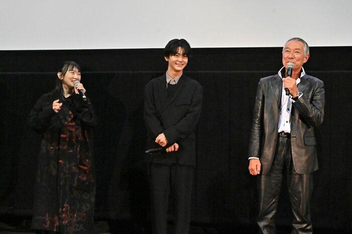 生駒さんは「室井さんと同じ由利本荘市出身の生駒です。まさか自分が小さい頃から来ていたこの映画館で、舞台挨拶に出る側として、そしてギバちゃんの映画に出るなんて!と思って頑張ってきました」とあいさつ。