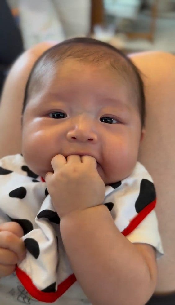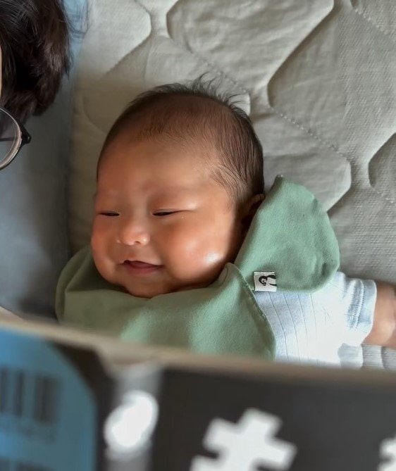 ぷくぷくのほっぺがとってもかわいらしい壱くんですが、ある日のパパに寝かしつけられているときの表情に「何回見ても笑える!!」「いぶし銀俳優のような鋭い視線。ただものじゃないですね?笑」などの声が寄せられ、5.4万いいね(2025年8月14日現在)がされるほど話題に。