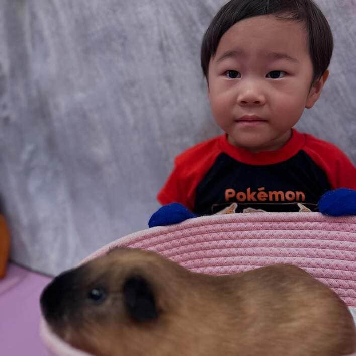 そして、ハリネズミだけでなく、モルモットとも一緒に写真を撮ってもらったやさ丸くん。
