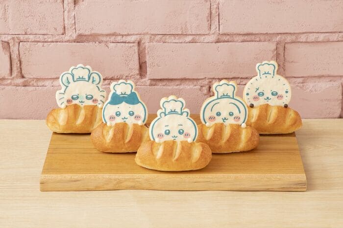 ちいかわ、ハチワレ、うさぎ、モモンガ、ラッコのクッキーと、カスタードクリームもしくはチョコレートクリームをサンドしたやわらかい食感のフランスパン