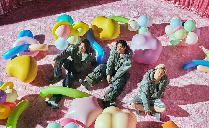 投稿された写真には、MVにも出てくるピンクのカーテンや床が目を引く空間に星や丸などさまざまな形をした風船に囲まれた平野さんたちが座った様子がおさめられています。