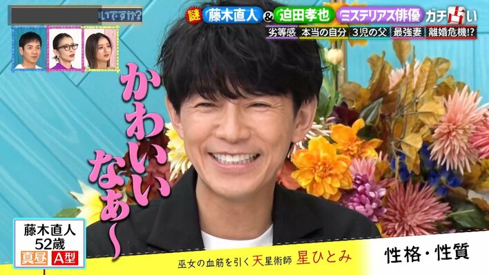 8月17日放送の『突然ですが占ってもいいですか?』は、藤木直人さんと迫田孝也さんが、星ひとみさんに占われました。