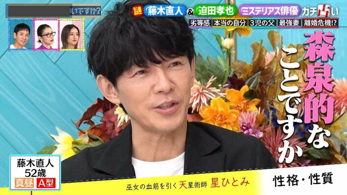 そして「“開放している人たち”とのほうが(相性が)合う」と占われると、藤木さんは「森泉的なことですか?」と、トーク番組『おしゃれイズム』(日本テレビ)で共演していた森さんを挙げてニヤリ。