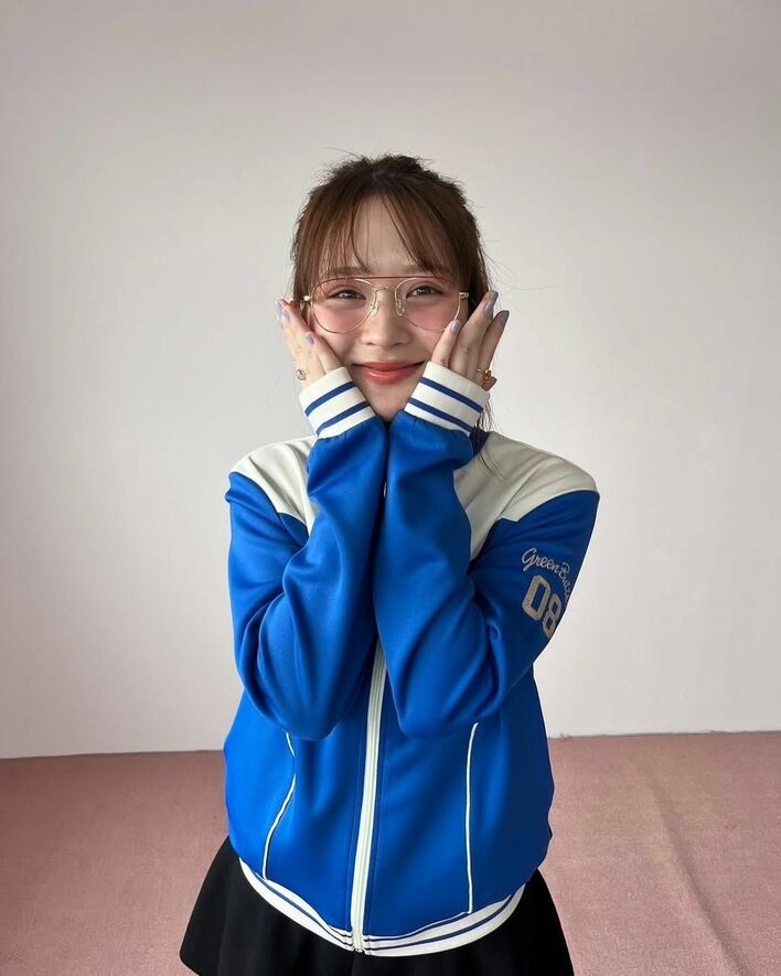別の写真では、青のジャージを羽織り、ピンク色のレンズのサングラスをかけ、小顔ポーズでカメラを見つめるショットや…