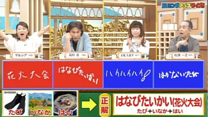 正解は「はなびたいかい(たび+いなか+はい)」。マルシアさんと高杉さんが正解!