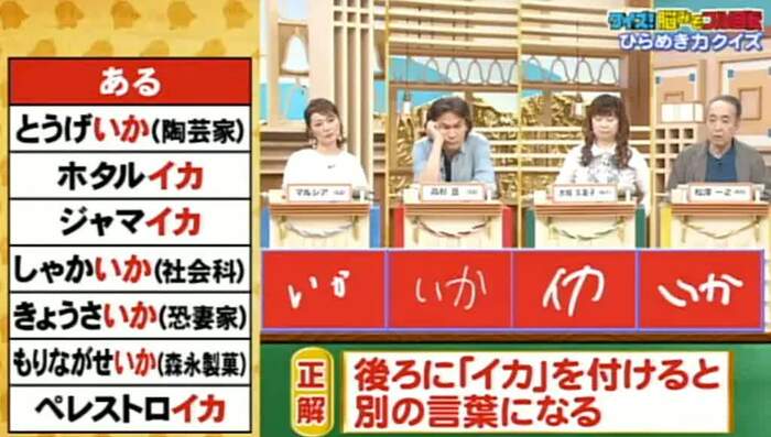 正解は「後ろに『イカ』をつけると別の言葉になる」。見事に全員正解!