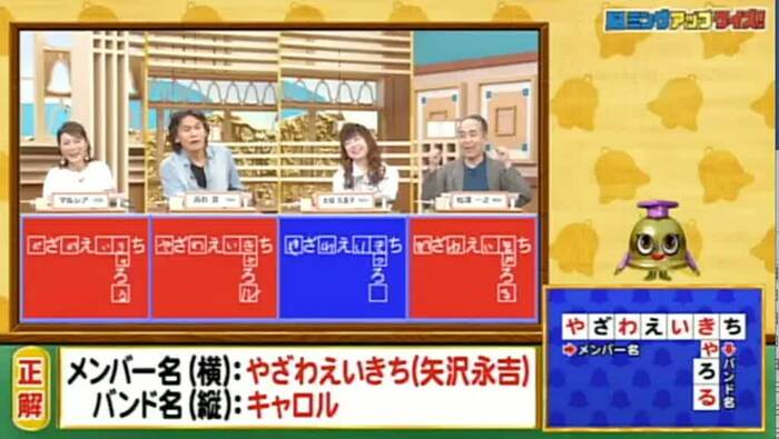 正解はメンバー名が「やざわえいきち(矢沢永吉)」、バンド名が「キャロル」。マルシアさん、高杉さん、松澤さんの3人が正解。