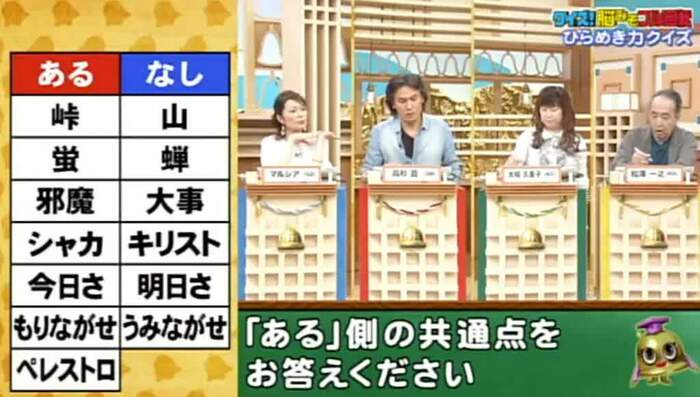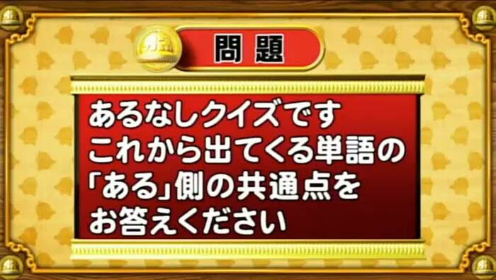 最後は、あるなしクイズ。次の単語の「ある」側の共通点を答えてください。