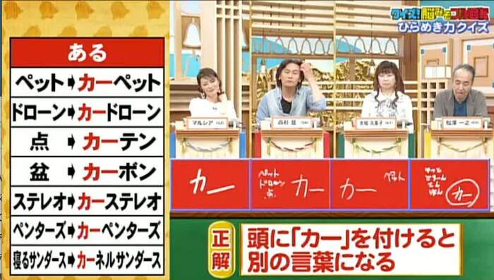 正解は「頭に『カー』をつけると別の言葉になる」。見事に全員正解!