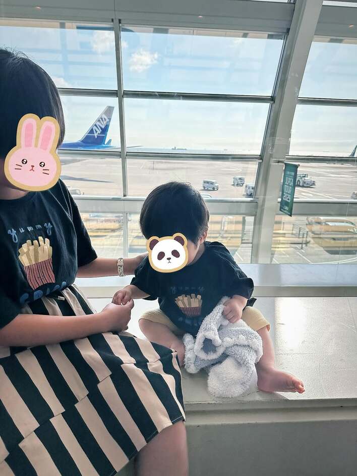 空港で撮影された写真には、フライドポテトのイラストがデザインされたお揃いのTシャツを着た姉弟の姿が。ガラス張りのロビーに座る2人の背後には飛行機も見え、ワクワクとした旅の始まりを感じます。