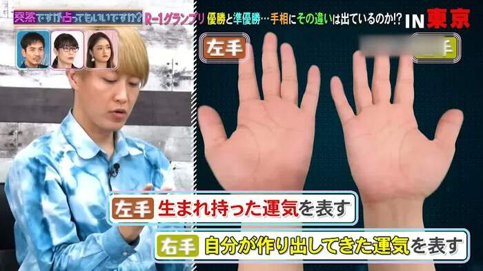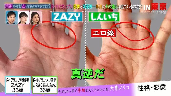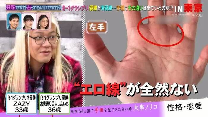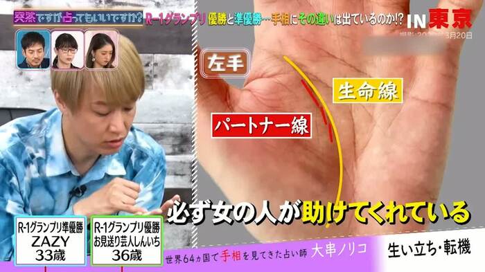 占いはさらに続き、大串さんはしんいちさんの手相を見ながら「パートナー線がある。18歳から35歳ぐらいまでずっと、女の人が支えてきていると思います」と具体的に見立てた場面も。