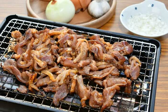 早速、下味をつけた鶏肉を網の上で焼いていきますが、「焼肉って牛なんじゃないんですか?」と松岡さんは驚きの声をあげます。