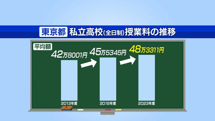 私立学校の授業料(平均額の比較)が、10年前の42万8001円から48万円以上と高騰する中で、決定された今回の政策。