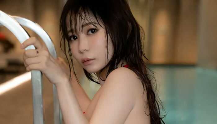 今回公開されたのは、赤い水着でプールからあがるバックショットと、 Tシャツ1枚で猫と戯れる自然体のカットの2枚。真っ赤な水着姿は、写真集に向けて体づくりをしたという中川さんのキュッと上がった美しいヒップと、しっとりとした大人っぽい表情が見どころ。