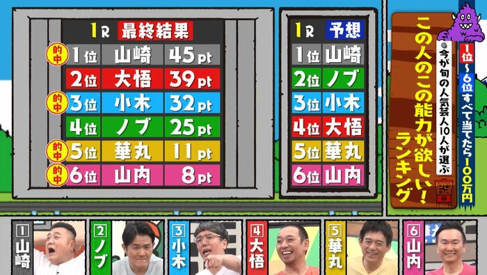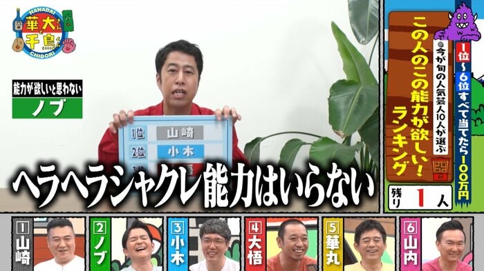「いや、ノブちゃん!(2位が)『俺なわけない』と思えないの?」(山崎)、「なんでおまえが勝手に上がってくるんだよ!」(小木)と、手のひらを返した一同から非難の声が。