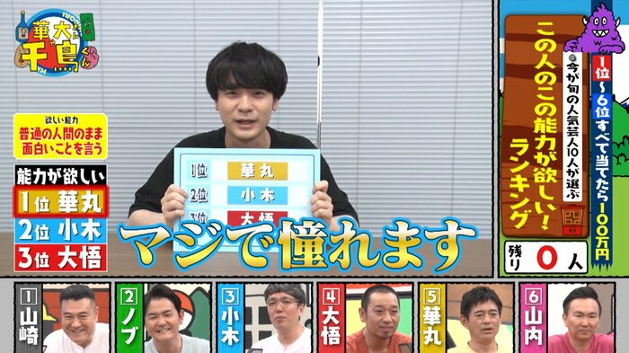 井口さんは、山崎さんについては「信じられない距離歩く番組でも、ずっとボケ続けていて、単純に体力がヤバい」と語り、ノブさんについては「ヘラヘラしてシャクレてて、ヘラヘラシャクレ能力はいらない」とバッサリ。