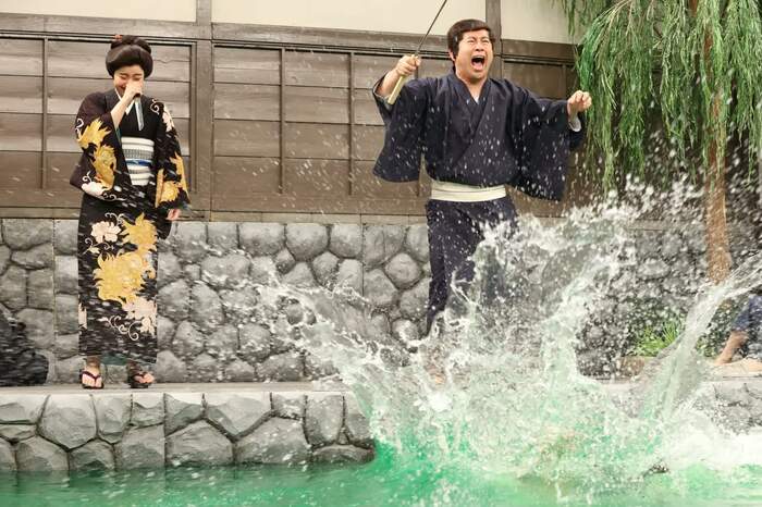 「実は私、泳げないんです」と話す井上さんと、「顔に水をつけるのがめちゃくちゃ苦手で」と話す山之内さんは「時代劇映画撮影」というコントに登場。かつての収録スタイル同様、水に落ちるリハーサルがないまま本番が始まり…。