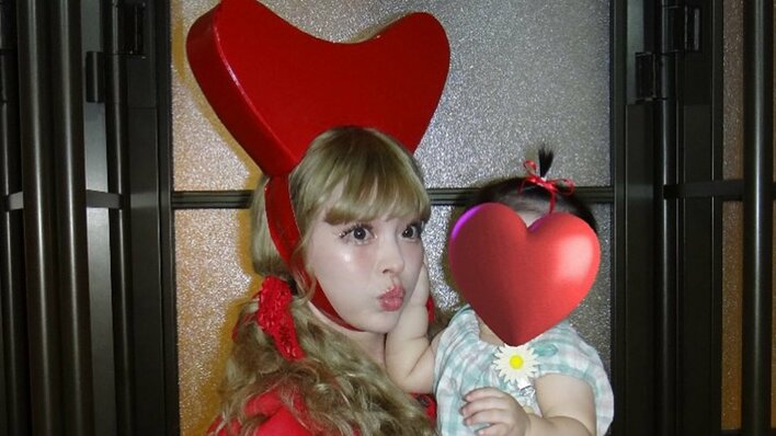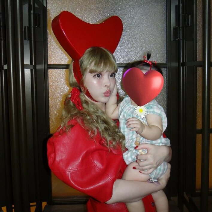 ボリューミーなスリーブに、頭にはハート型の帽子といったきゃりーさんらしさ全開の真っ赤な衣装を身に纏い、口をすぼめるきゃりーさん。そんなママにむちむちとした腕でしがみつく赤ちゃんは、髪の毛を赤いリボンで結ばれ、かわいいちょんまげ頭に。