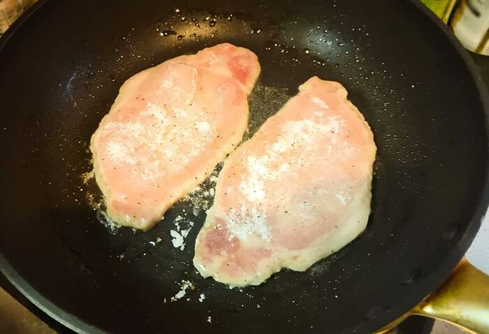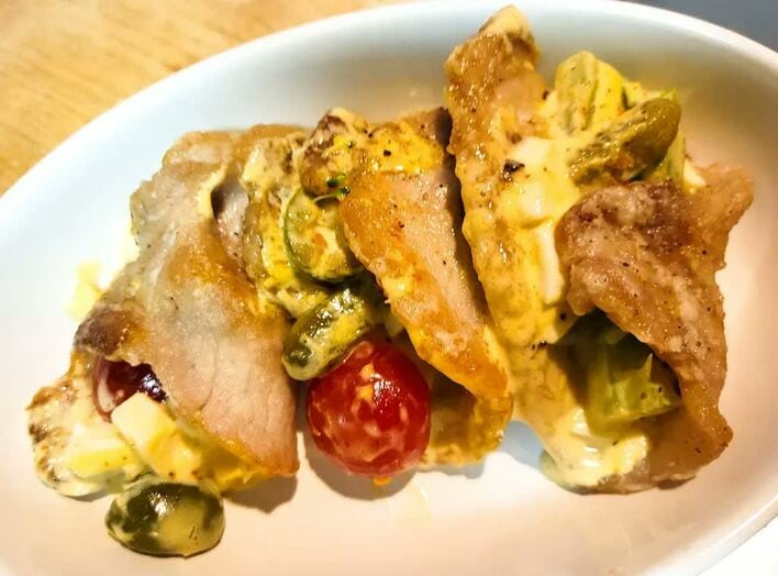 5.油をひいたフライパンで豚肉を両面焼いたら、3でできた具材を豚肉に乗せて軽く巻きます。