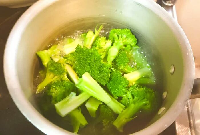 3.カットしたブロッコリーとコップ1杯ほどの水を鍋に入れて、フタをします。「ゆでる」のではなく「蒸す」のがポイントです!蒸し終わったら水に長くさらさず、自然に冷まします。