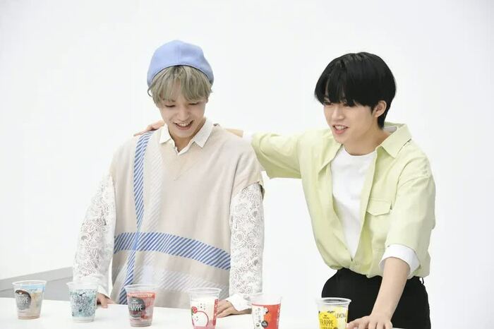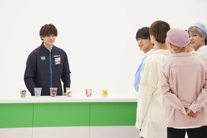 ファミリーマートのユニフォームという貴重な姿を魅せる鶴房汐恩が慣れた様子で「いらっしゃいませ」と声をかけると、メンバーたちが笑顔で集まって来る。すでに彼らの仲の良さが垣間見えるのだが、鶴房からつくり方を促されモミモミガシガシしながら、リラックスして楽しそうにじゃれ合う姿はファン垂涎もの。