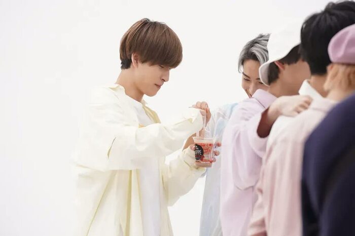 今回公開された映像では、JO1のメンバー全員でファミマフラッペをじゃれ合いながら楽しむ姿が映し出されている。