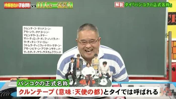 首都の名前を聞いて国名を答える問題では、地理担当の村瀬哲史先生がタイの首都「バンコク」の正式名称を教えてくれました。