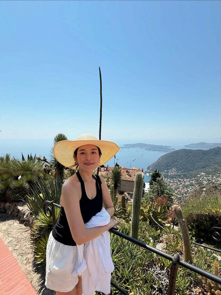 エズにある植物園を訪れた筧さんは、背の高いサボテンが並ぶ高台で、麦わら帽子をかぶり、ホルターネックのトップスとショートパンツ姿でカメラにうれしそうな笑顔を向けています。