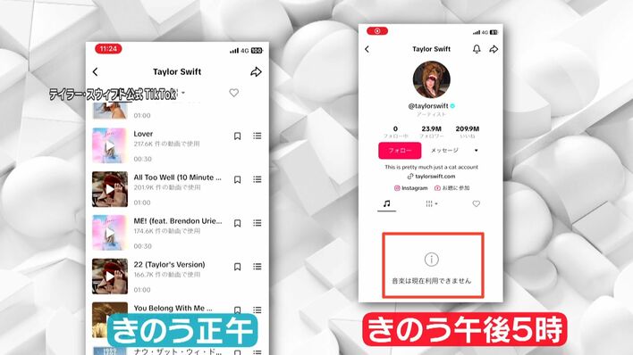 2月1日正午時点ではTikTokに多く提供されていたテイラー・スウィフトさんの楽曲。しかし、午後5時ごろには全て削除され、利用できない状況に...。