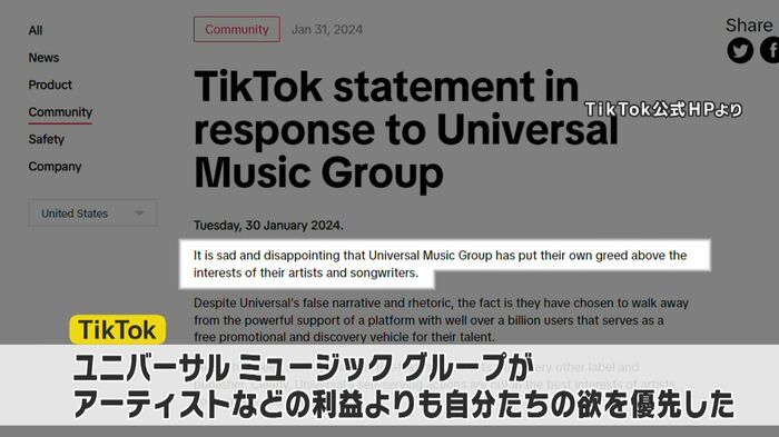 一方、TikTokは、「ユニバーサル・ミュージック・グループがアーティストなどの利益よりも自分たちの欲を優先した」などと主張しています。