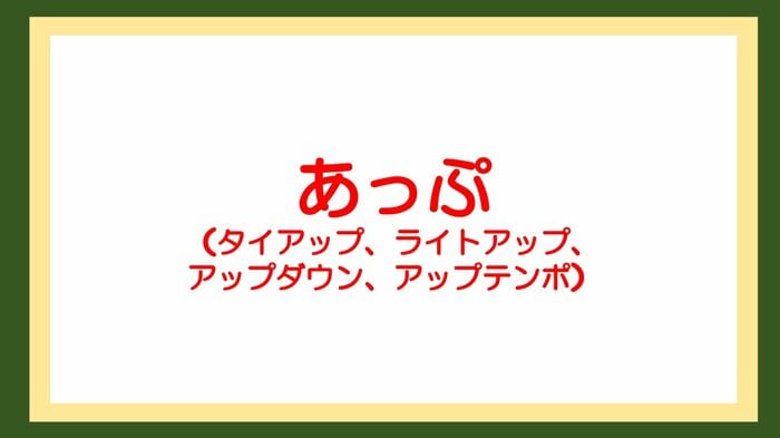 正解は「あっぷ(タイアップ、ライトアップ、アップダウン、アップテンポ)」。