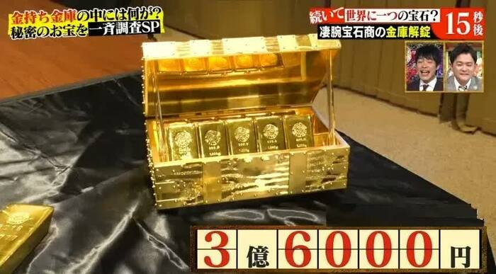 そして遂に金庫の中のお宝が到着。まず登場したのは、約12kgの金の延べ棒。大口の取り引きでしか使わないそうで、なんと約8000万円の価値がある。