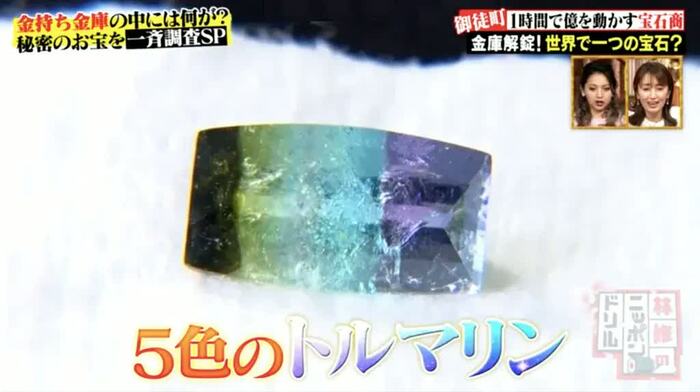 そして極めつきは、23年の宝石商人生で初めて出合ったという5色のトルマリン。通常、トルマリンの色はグラデーションになり、ハッキリと色が分かれているものは本当に珍しく「業界でもほとんどの方が、見たことがないと思う」とのこと。恩人から譲り受けたというこの品だけは、2億円でも売ることができないそうだ。