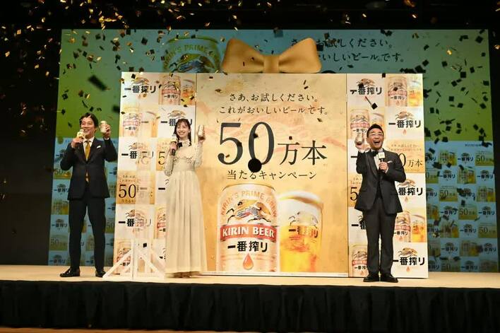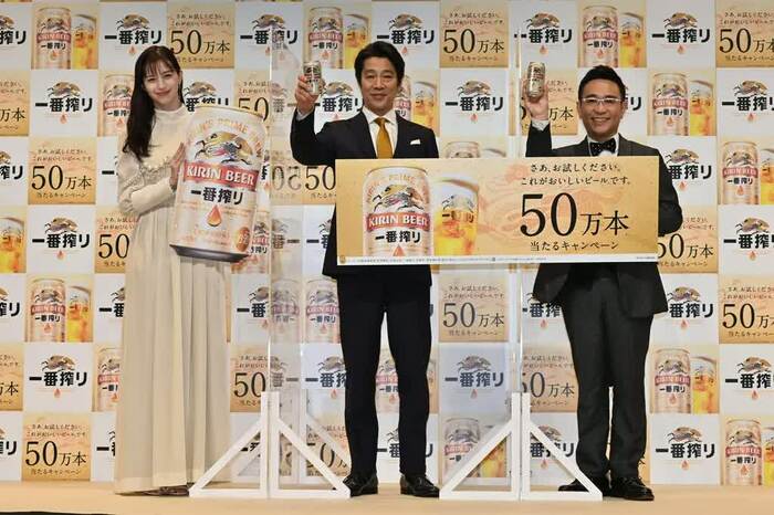 4月25日、「キリン一番搾り」の新キャンペーン発表会が行われ、堤真一さん、八嶋智人さん、中条あやみさんが登場しました。