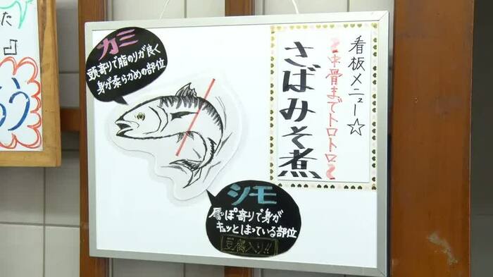 お店のサバ味噌には「カミ」(頭寄り)、「シモ」(尻尾寄り)の2種類があり、夫の安久さんは、多い日で1日に50匹を切り分けます。