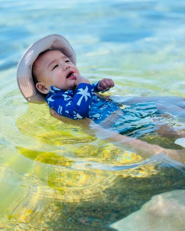 最近の投稿では、「ボクの夏休み」というコメントと共に、海で遊ぶ親子ショットを披露していました。栗原さんに抱っこされ、海につかる陽太くんは、アイボリーの帽子をかぶり、ご機嫌な様子!