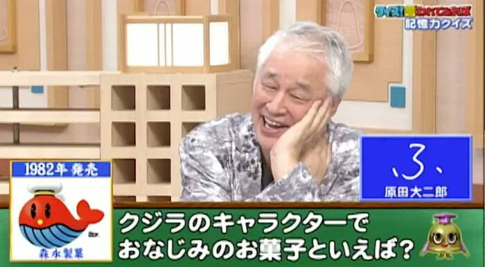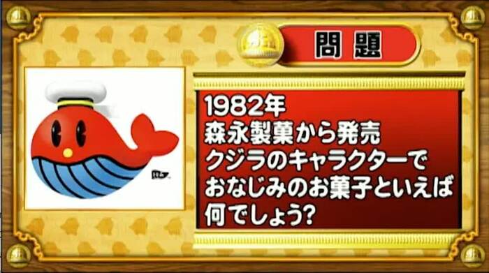 最後は、キャラクター問題。1982年に森永製菓から発売された、クジラのキャラクターでおなじみのお菓子といえば何でしょう?