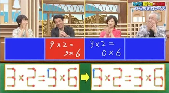 正解は、まず、右の式の「9」から1本を動かし「3」にします。その1本を左の式の「3」に足して「9」にします。そうすれば「9×2=3×6」となります。山口さん1人が見事正解!