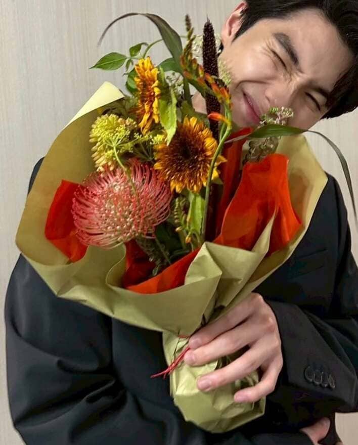 ブラックスーツに身を包み、首をかしげながら花束を胸の前で抱えています。