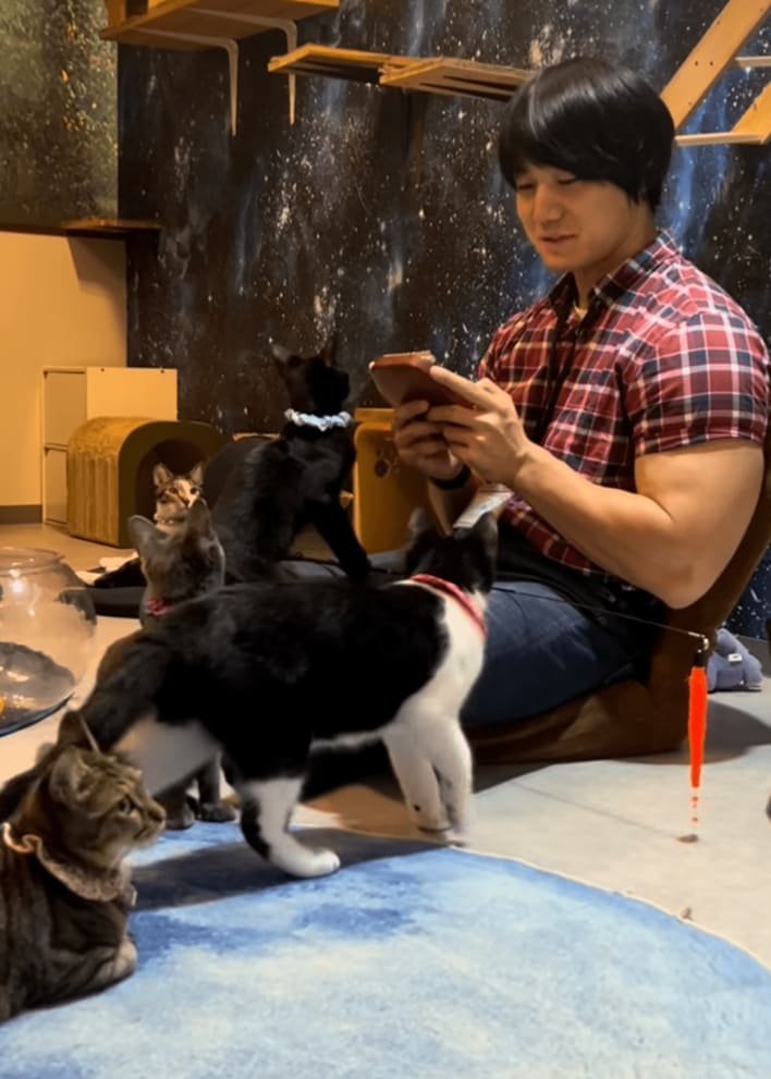 その姿で保護猫カフェに座る青木さんの手には、特技だという楽器「カリンバ」が握られ、