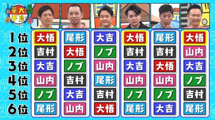 シンプルに大吉さんが1位で、安定のノブさんが2位。“なんだかんだ”票を集めそうな大悟さんが3位、残る山内さんが4位の予想席に座ろうとしましたが――と、ここで華丸さんが「大悟くん、もうちょっと上のような気がする」と言い出して、ギリギリのところで予想順位を変更。