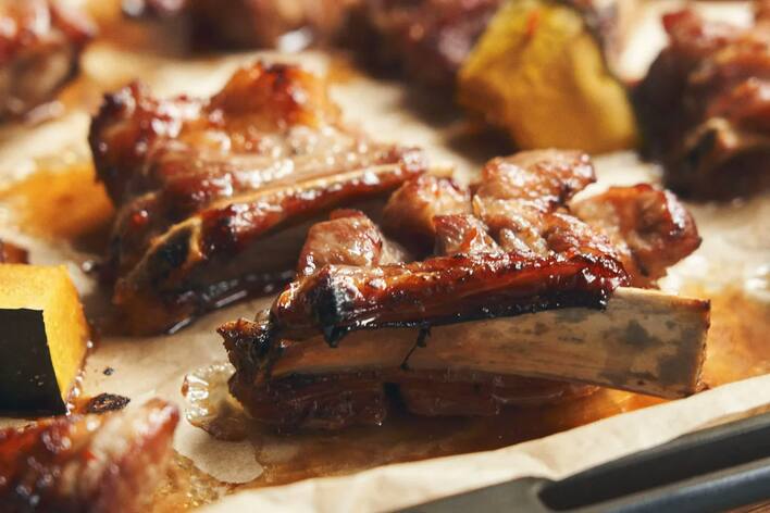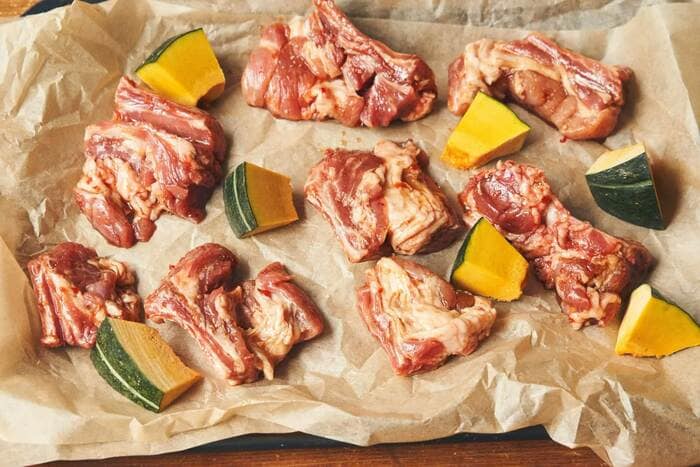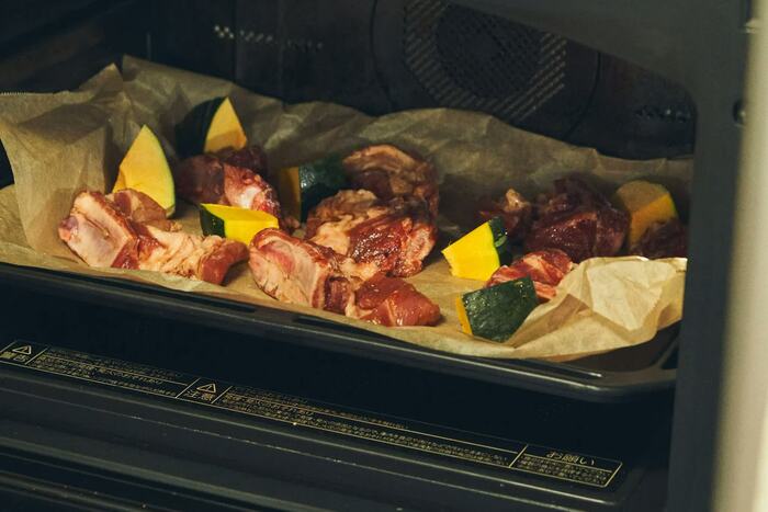 天板にクッキングシートを敷き、スペアリブをのせて、間にかぼちゃをのせます。アルミホイルを使う場合は、くっつかないように、オリーブオイルを塗っておきましょう。