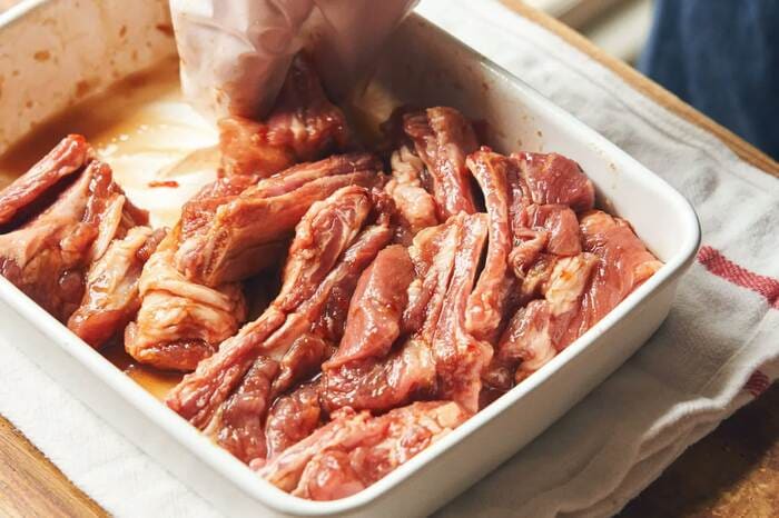 骨から外れやすくするためにお肉に切れ目を入れるのがポイントで、調味料は2種類だけ!漬けダレを和えたら、あとはオーブンにお任せでOK。